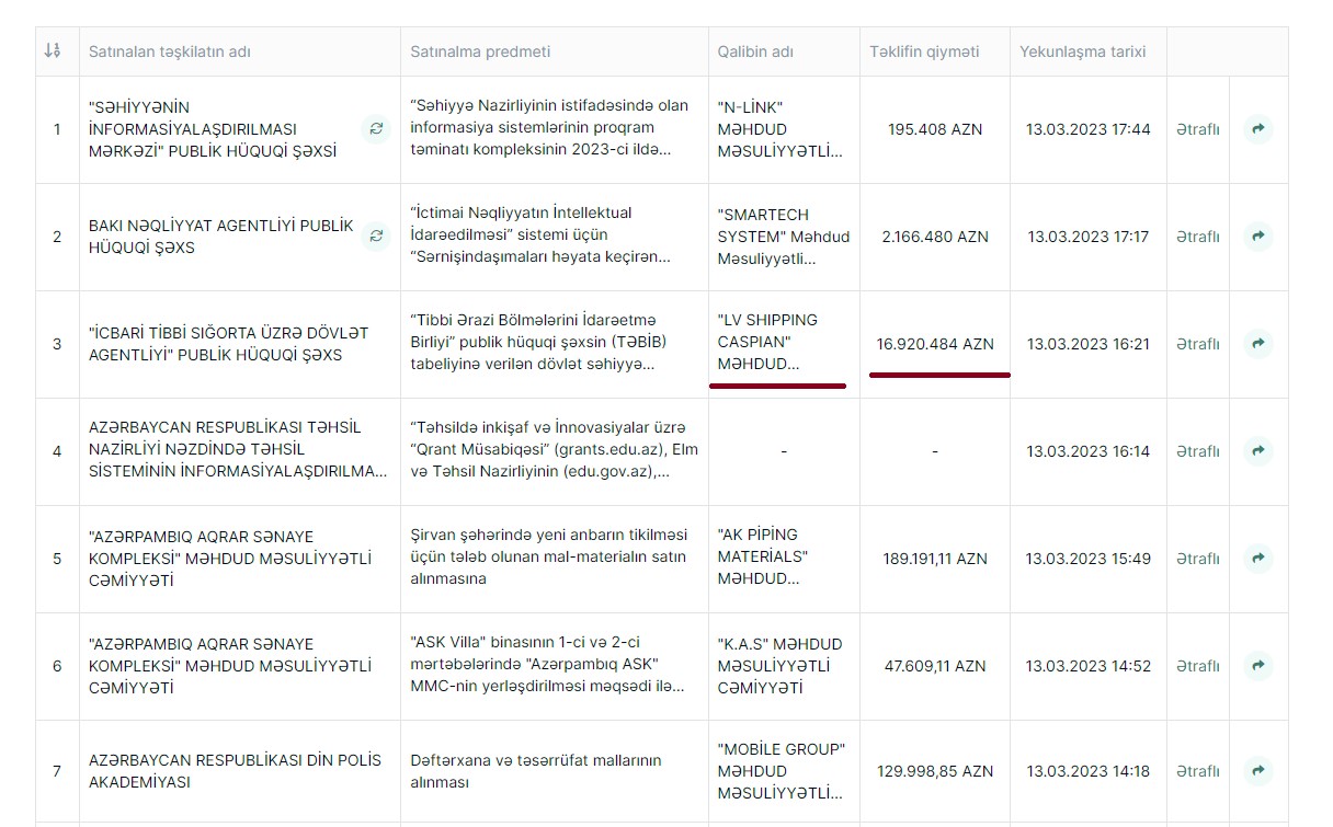 Marja xəbər verir ki, tenderdə qalib "LV SHIPPING CASPIAN" MMC şirkətdir.