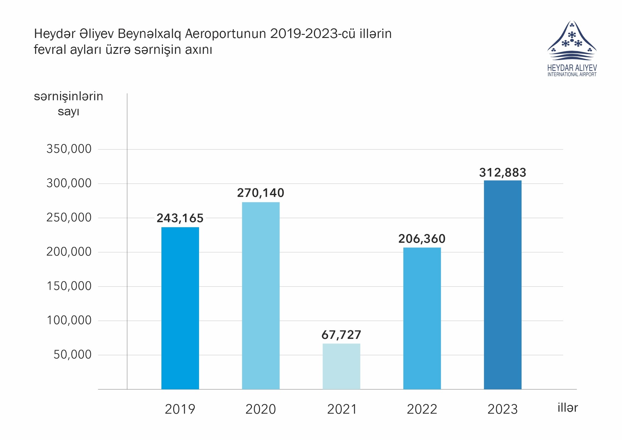 Qeyd edilib ki, 2023-cü ilin fevral ayında bu rəqəm 312,883 min nəfər idisə, 2019-cu ilin eyni dövründə bu göstərici 243,165 min nəfərə bərabər olub. 2020, 2021 və 2022-ci illərin fevral aylarında Bakı hava limanının sərnişin axını müvafiq olaraq 270 min, 67 min və 206 min nəfər sərnişini ötüb.