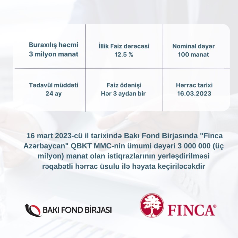 Birjanın yaydığı məlumata görə, 16 mart 2023-cü il tarixində "Finca Azərbaycan" QBKT MMC-nin istiqrazlarının yerləşdirilməsi Bakı Fond Birjasında rəqabətli hərrac üsulu ilə həyata keçiriləcəkdir.