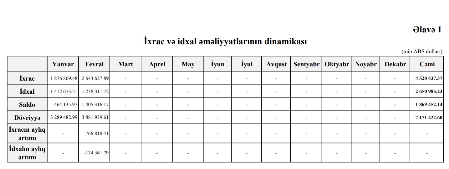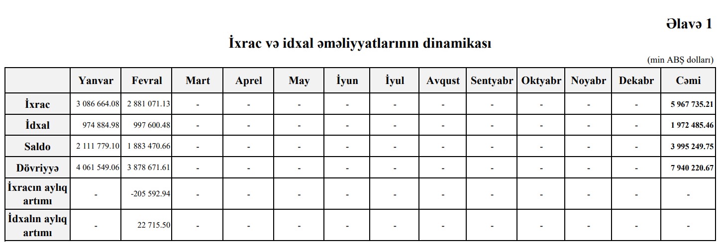 Xatırladaq ki, 2022-ci ilin yanvar-fevral dövründə Azərbaycanən xarici ticarət əməliyyatlarının həcmi 7 milyard 940 milyon 221 min ABŞ dollar, ixrac 5 milyard 967 milyon 735 min dollar, idxal 1 milyard 972 milyon 485 min dollar, müsbət saldo 3 milyard 995 milyon 249 min dollar təşkil etmişdi. Beləliklə, Azərbaycanın ixracı azalıb, idxalı artıb, müsbət saldo 2 dəfədən çox kiçilib