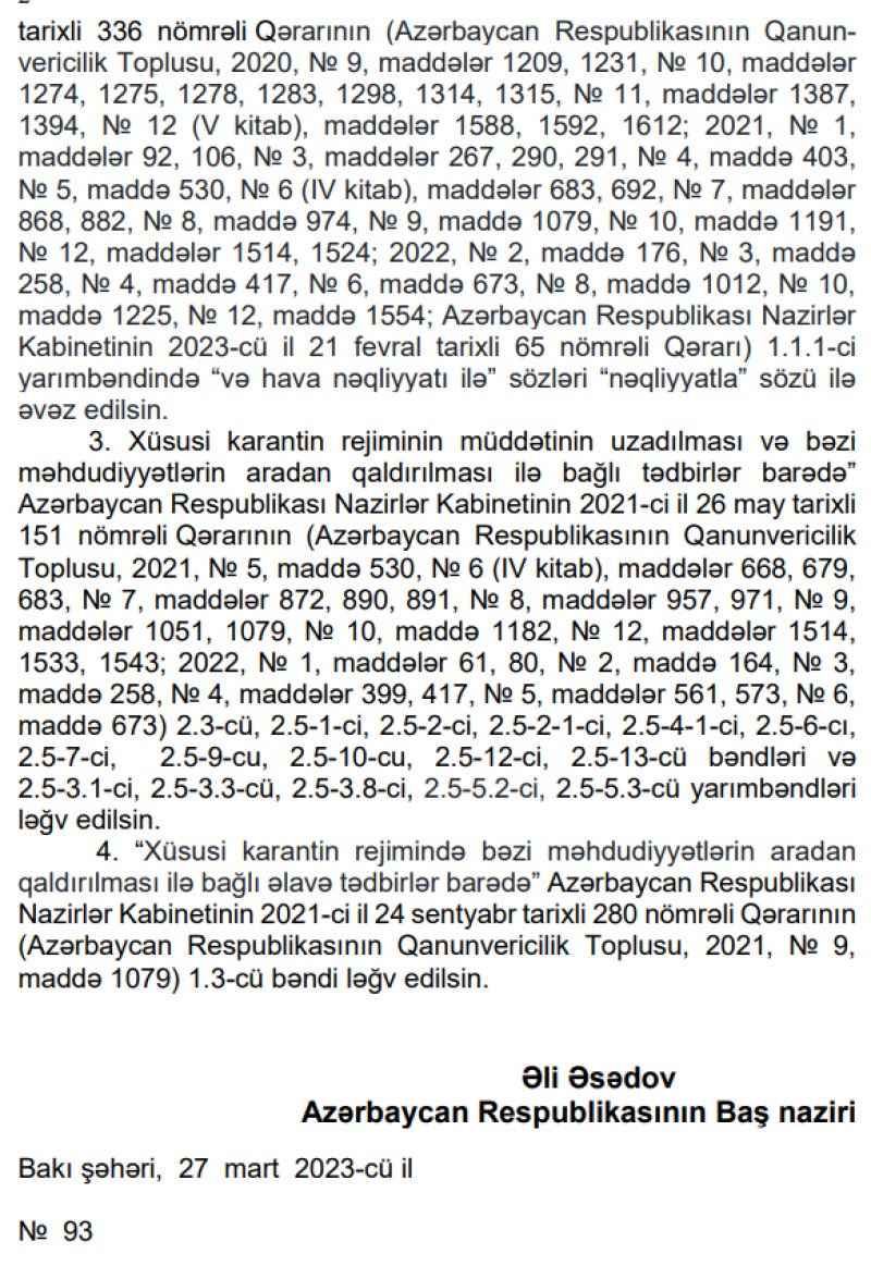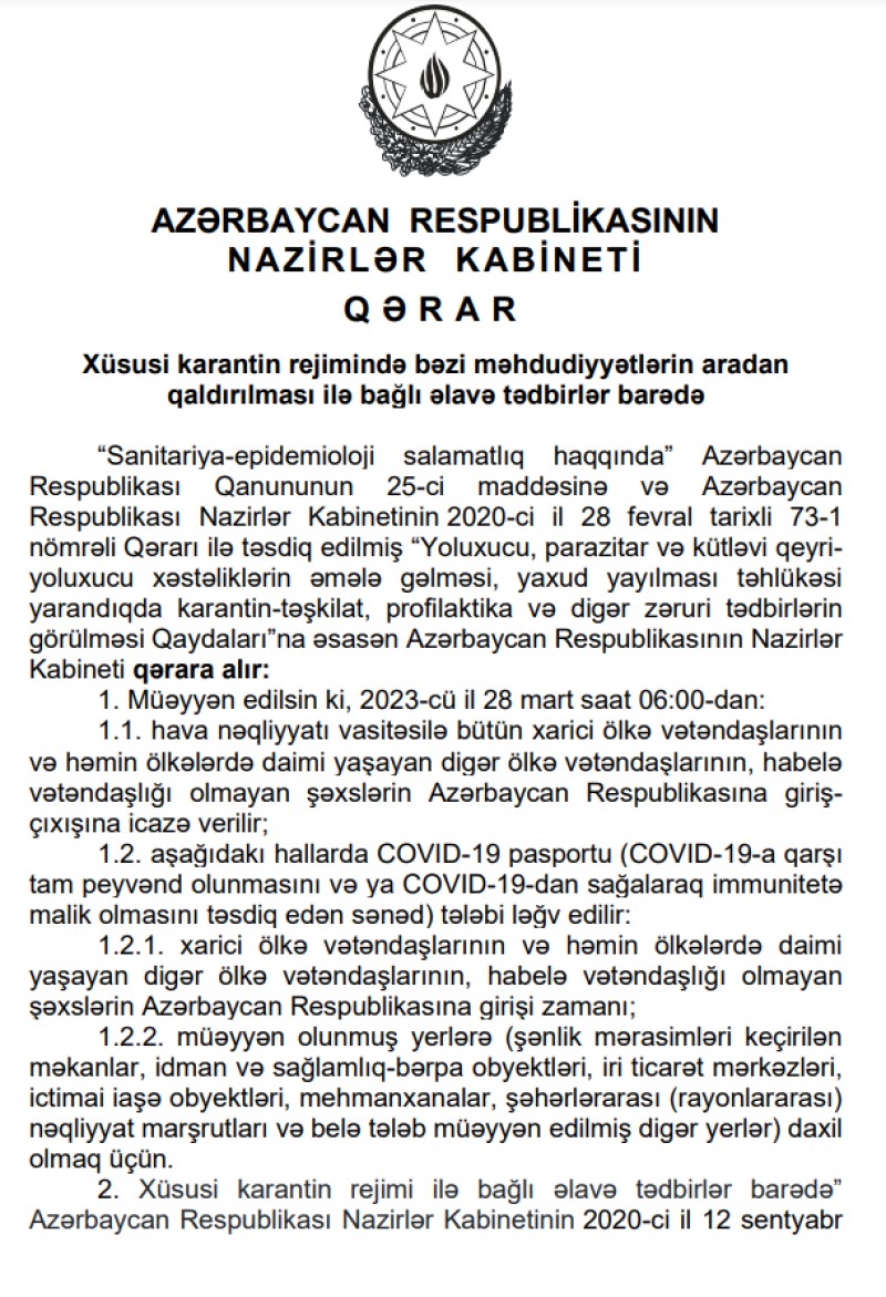 Beləliklə, yük daşımaları istisna olmaqla, ölkə ərazisinə yerüstü nəqliyyatla giriş-çıxışın dayandırılması qüvvədə qalır. Bugünədək, yerüstü nəqliyyat ilə bərabər hava nəqliyyatı ilə də ölkə ərazisinə giriş-çıxış dayandırılmışdı. 2023-cü il 28 mart saat 06:00-dan hava nəqliyyatı vasitəsilə bütün xarici ölkə vətəndaşlarının və həmin ölkələrdə daimi yaşayan digər ölkə vətəndaşlarının, habelə vətəndaşlığı olmayan şəxslərin Azərbaycan Respublikasına giriş-çıxışına icazə verilir.