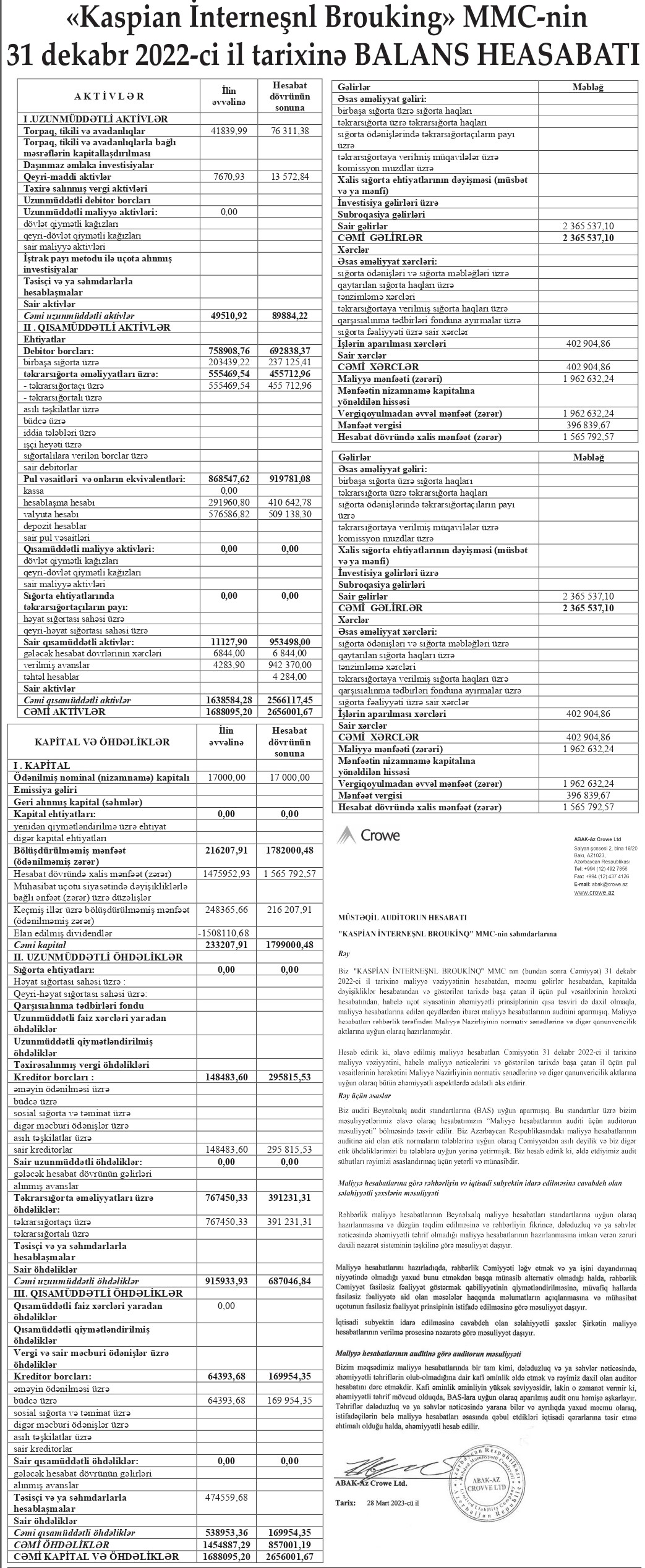 Sığorta və təkrarsığorta brokeri "Kaspian İnterneşnl Broukinq" MMC (Caspian International Broking) 2022-ci ili 1 milyon 566 min manat xalis mənfəət ilə başa vurub.