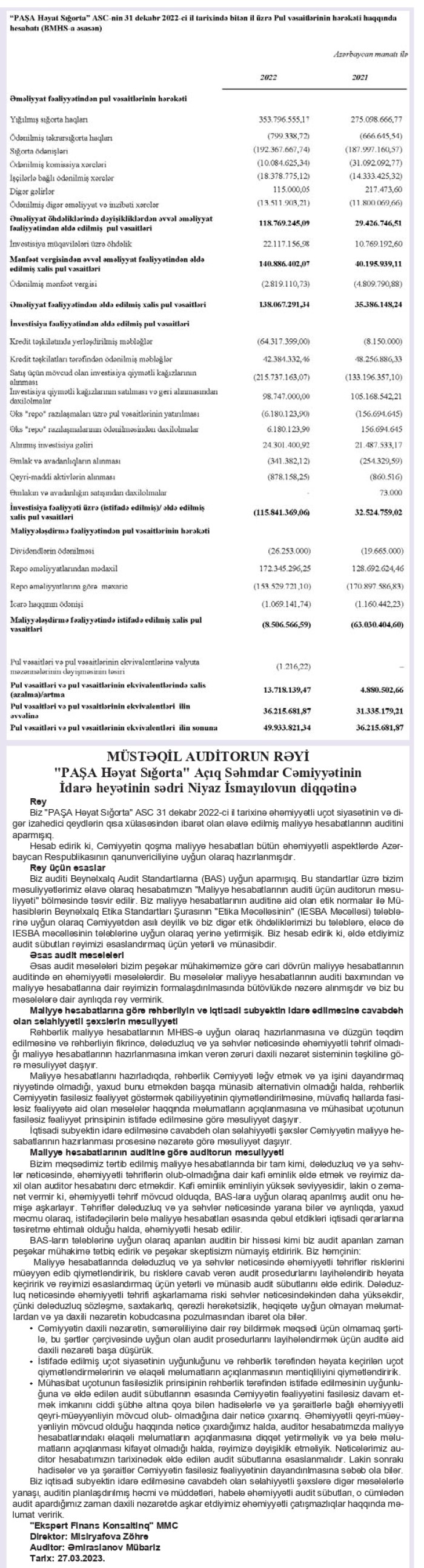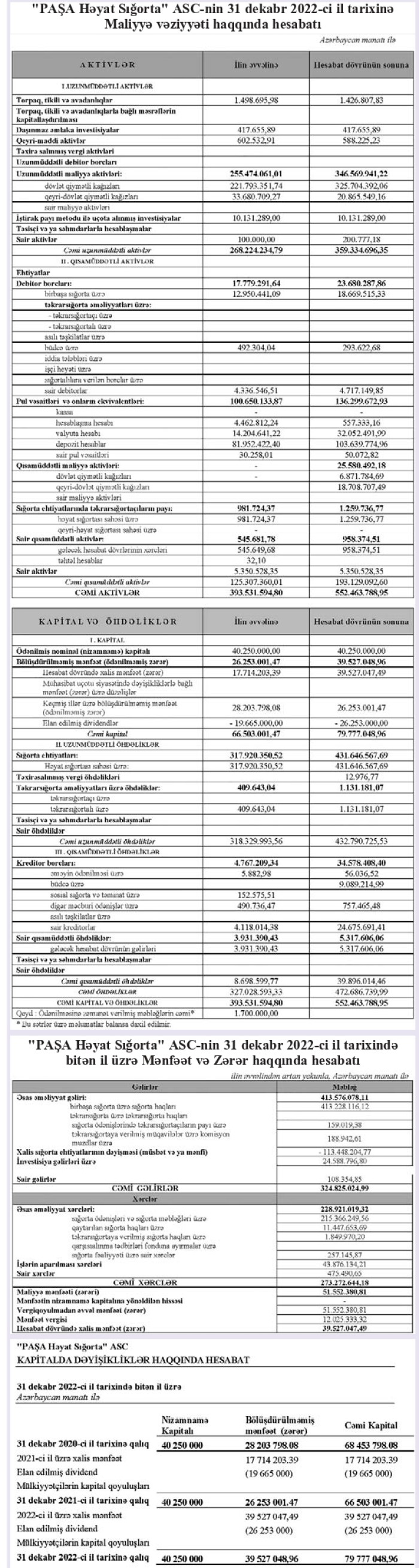 Qeyd edək ki, “PAŞA Həyat Sığorta” ASC Maliyyə Hesabatlarının Beynəlxalq Standartlarını (MHBS) əsasında da hazırlanmış maliyyə hesabatlarını dərc edib. MHBS hesabatına əsasən, “PAŞA Həyat Sığorta” şirkəti 2022-ci ili 26 milyon 117 min manat xalis mənfəət ilə başa vurub.