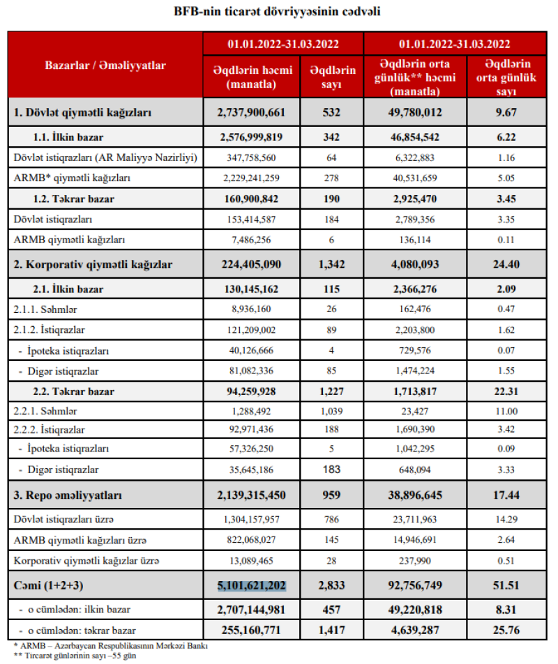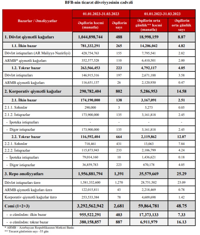 Bakı Fond Birjasında 2023-cü ilin -yanvar - mart ayı ərzində qiymətli kağızlar üzrə keçirilən əməliyyatların ümumi həcmi 3 milyard 292 milyon 563 min manat təşkil edib. Ötən ilin eyni dövründə əməliyyatların həcmi 5 milyard 101 milyon 621 min manat təşkil etmişdi.