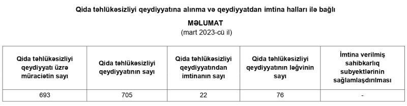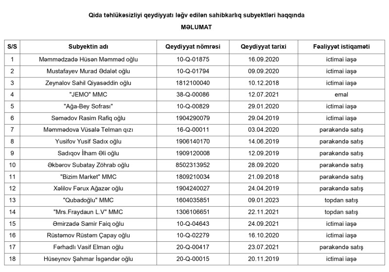 "Qida təhlükəsizliyi haqqında"Azərbaycan Respublikasının Qanununa görə, Azərbaycan Respublikasının ərazisində qida və yem məhsullarının ilkin istehsalı, istehsalı, emalı, dövriyyəsi və utilizasiyası həyata keçirilən qida obyektləri qeydiyyata alınır. Qeydiyyata alınmadan və ya təsdiq olunmadan qida sahəsində fəaliyyət göstərmək qadağandır.