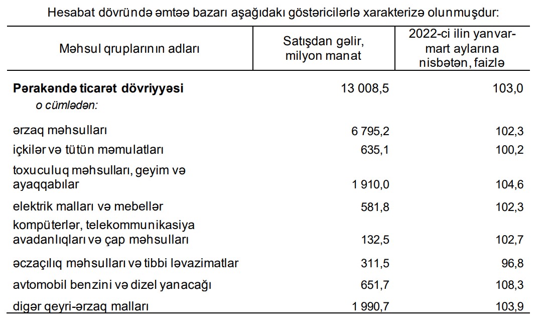Dövlət Statistika Komitəsinin yaydığı məlumata görə, 2023-cü ilin yanvar-mart aylarında pərakəndə ticarət şəbəkəsində istehlakçılara 13,0 milyard manatlıq, o cümlədən 7,4 milyard manatlıq ərzaq məhsulları, içkilər və tütün məmulatları, 5,6 milyard manatlıq qeyri-ərzaq malları satılmışdır.