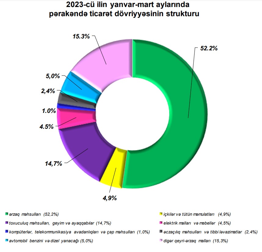 2023-cü ilin yanvar-mart aylarında alıcıların pərakəndə ticarət şəbəkəsində aldıqları mallara xərclədiyi vəsaitin 52,2 faizi ərzaq məhsullarının, 4,9 faizi içkilər və tütün məmulatlarının, 14,7 faizi toxuculuq məhsulları, geyim və ayaqqabıların, 5,0 faizi avtomobil benzini və dizel yanacağının, 4,5 faizi elektrik malları və mebellərin, 2,4 faizi əczaçılıq məhsulları və tibbi ləvazimatların, 1,0 faizi kompüterlər, telekommunikasiya avadanlıqları və çap məhsullarının, 15,3 faizi isə digər qeyri-ərzaq mallarının alınmasına sərf olunmuşdur.