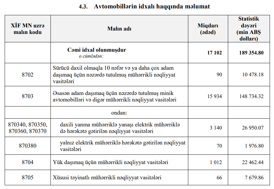 2022-ci ilin ilk rübündə Azərbaycana 189 milyon 354 min dollar dəyərində 17 min 102 ədəd nəqliyyat vasitələri idxal edilmişdi.
