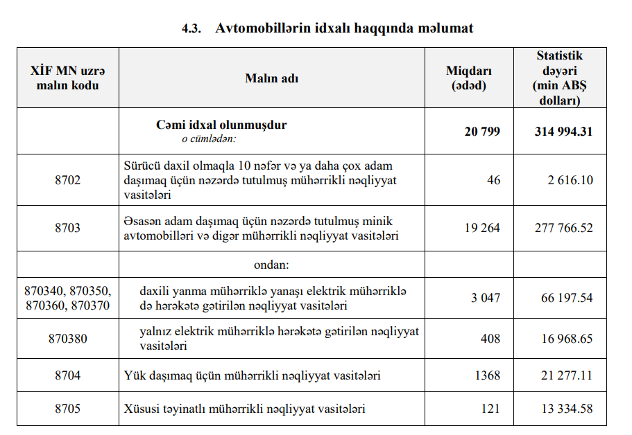 Avtomobil idxalı miqdar ifadəsilə 21,6%, məbləğ ifadəsilə isə 66% artıb. İdxalın dəyərinin (məbləğinin) miqdardan daha sürətlə artması avtomobillərin bahalaşdığına işarədir.2023-cü ilin ilk rübündə (yanvar-mart) Azərbaycana 314 milyon 994 min dollar dəyərində 20 min 799 ədəd nəqliyyat vasitəsi (avtomobil) idxal edilib.