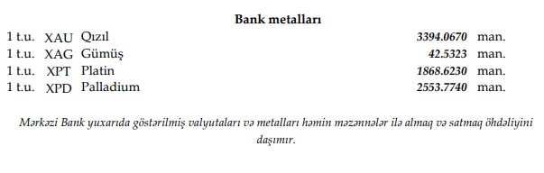 Azərbaycan Respublikasının Mərkəzi Bankı xarici valyutaların və bank metallarının Azərbaycan manatına qarşı RƏSMİ MƏZƏNNƏLƏRİ BÜLLETENİ