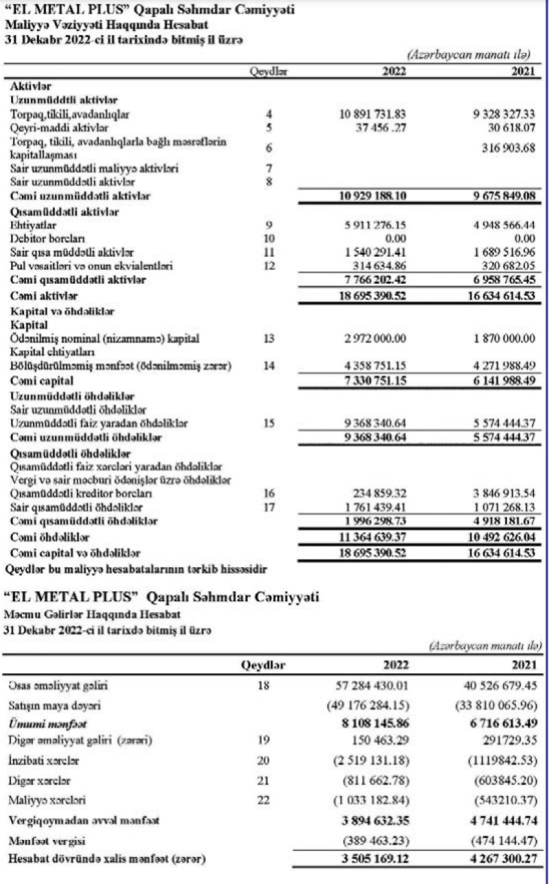 "El Metal Plus" QSC 2022-ci ili 3 milyon 505 min manat xalis mənfəət ilə başa vurub. Şirkət 2021-ci ili 4 milyon 267 min manat xalis mənfəət ilə bağlamışdı. Beləliklə, ötən il "El Metal Plus"un xalis mənfəəti 762 min manat və ya 17,8% azalıb.