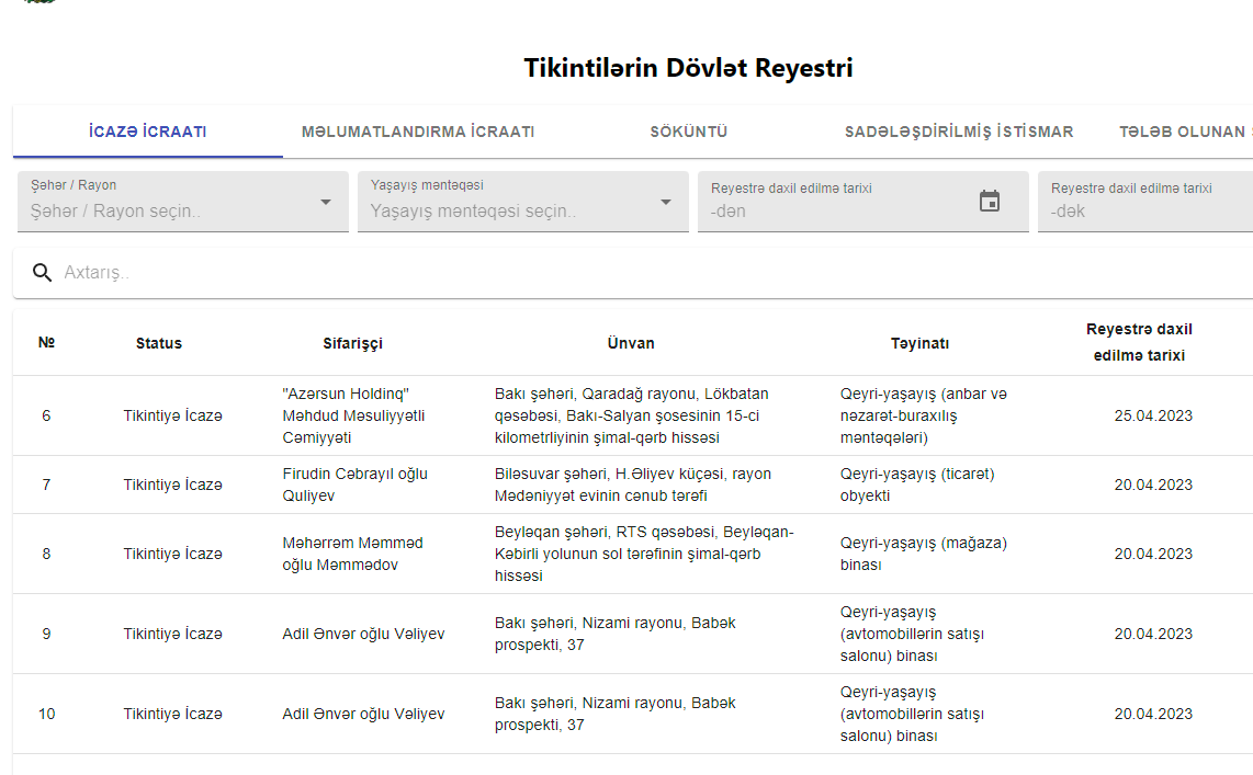 Marja.az Tikintilərin Dövlət Reyestrinə istinadən xəbər verir ki, Adil Ənvər oğlu Vəliyev bu məqsədlə icazə alıb. İcazə 20.04.2023-ü il tarixində Reyestrə daxil edilib.
