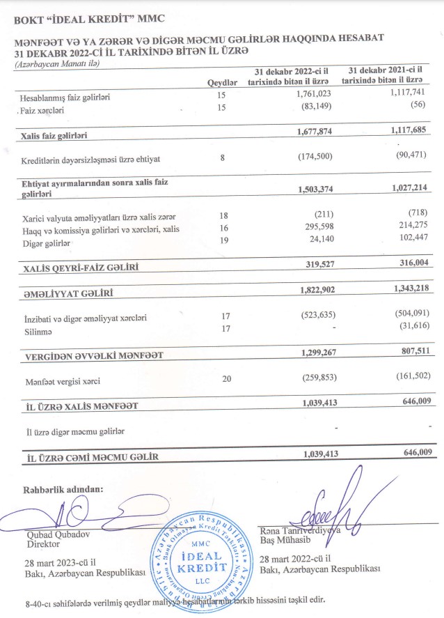 BOKT "İdeal Kredit" MMC 2022-ci ili 1 milyon 39 min manat xalis mənfəət ilə başa vurub. Təşkilat 2021-ci ili 646 min manat xalis mənfəət ilə başa vurmuşdu. Beləliklə, ötən il kredit təşkilatının xalis mənfəəti 393 min manat və ya 60,9% artıb.