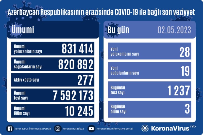 Azərbaycan Respublikasında koronavirus (COVID-19) infeksiyasına 28 yeni yoluxma faktı qeydə alınıb, 19 nəfər müalicə olunaraq sağalıb.