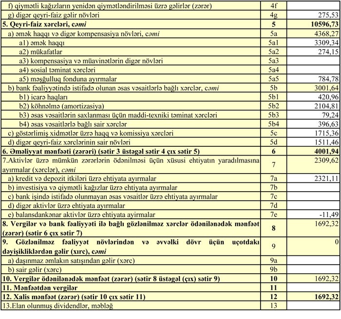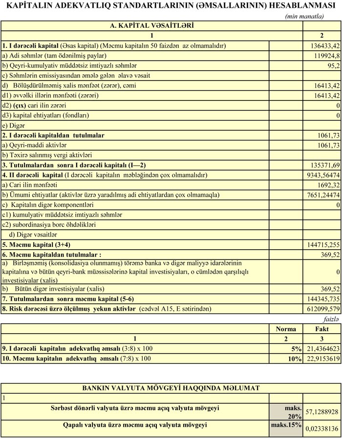 Bank 4 milyon manat əməliyyat mənfəətinin 2 milyon 309 min manatını ehtimal olunan kredit və depozit itkiləri üzrə ehtiyata ayırıb. Nəticədə Bankın 1 milyon 692,3 min manat xalis mənfəəti qalıb.