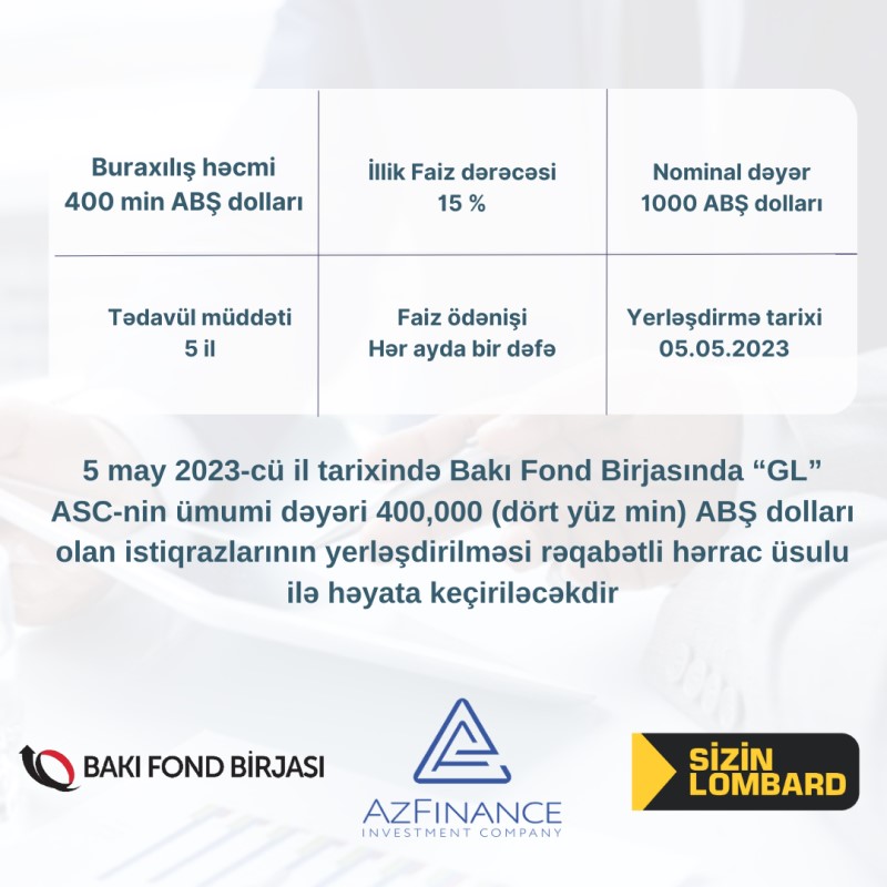 "Sizin Lombard" şəbəkəsinin sahibi olan “GL” ASC-nin istiqrazlarının yerləşdirilməsi üzrə hərrac keçiriləcəkdir .