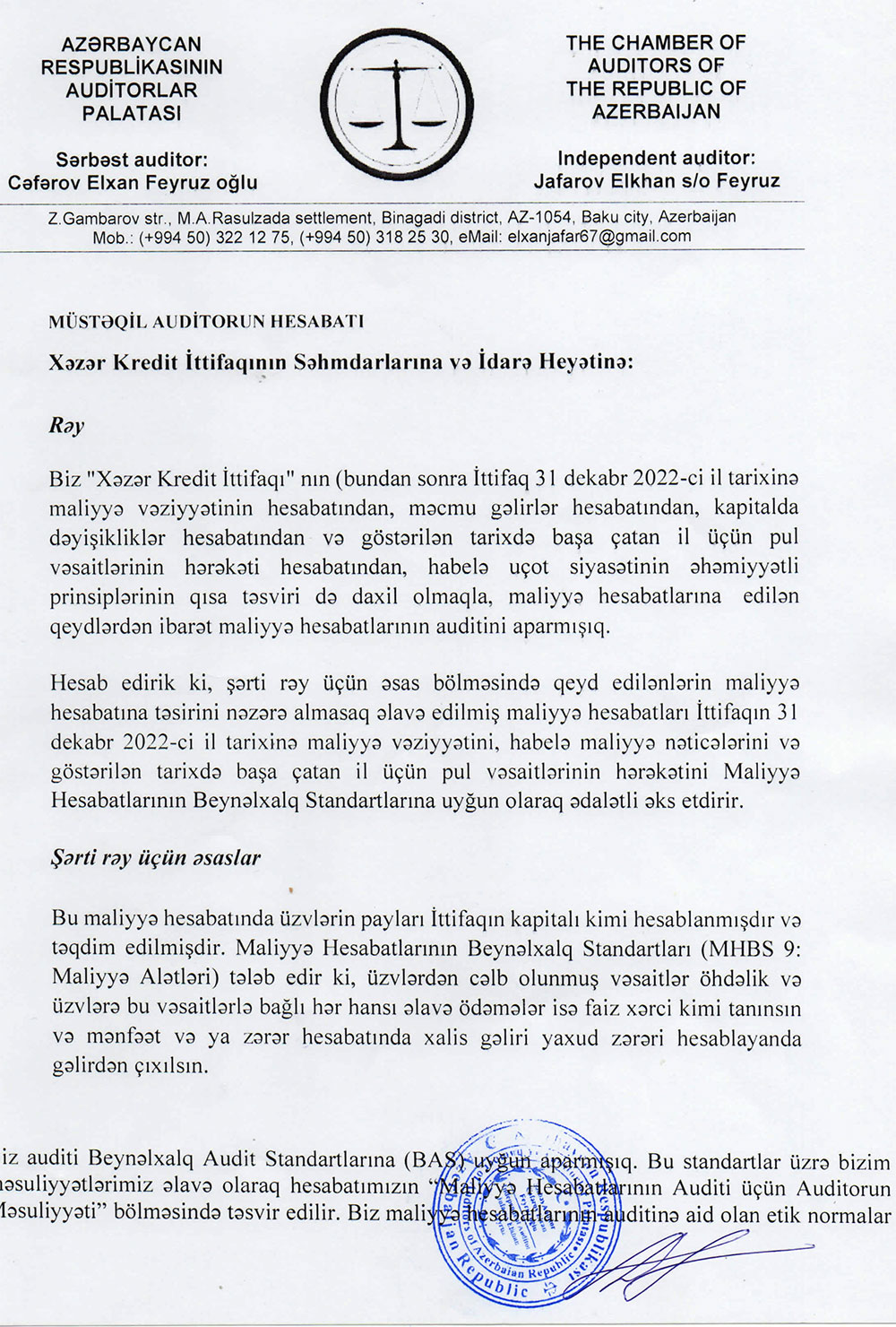 Lənkəranda fəaliyyət göstərən "Xəzər Kredit İttifaqı"nın 31 Dekabr 2022-ci il tarixinə maliyyə hesabatları.