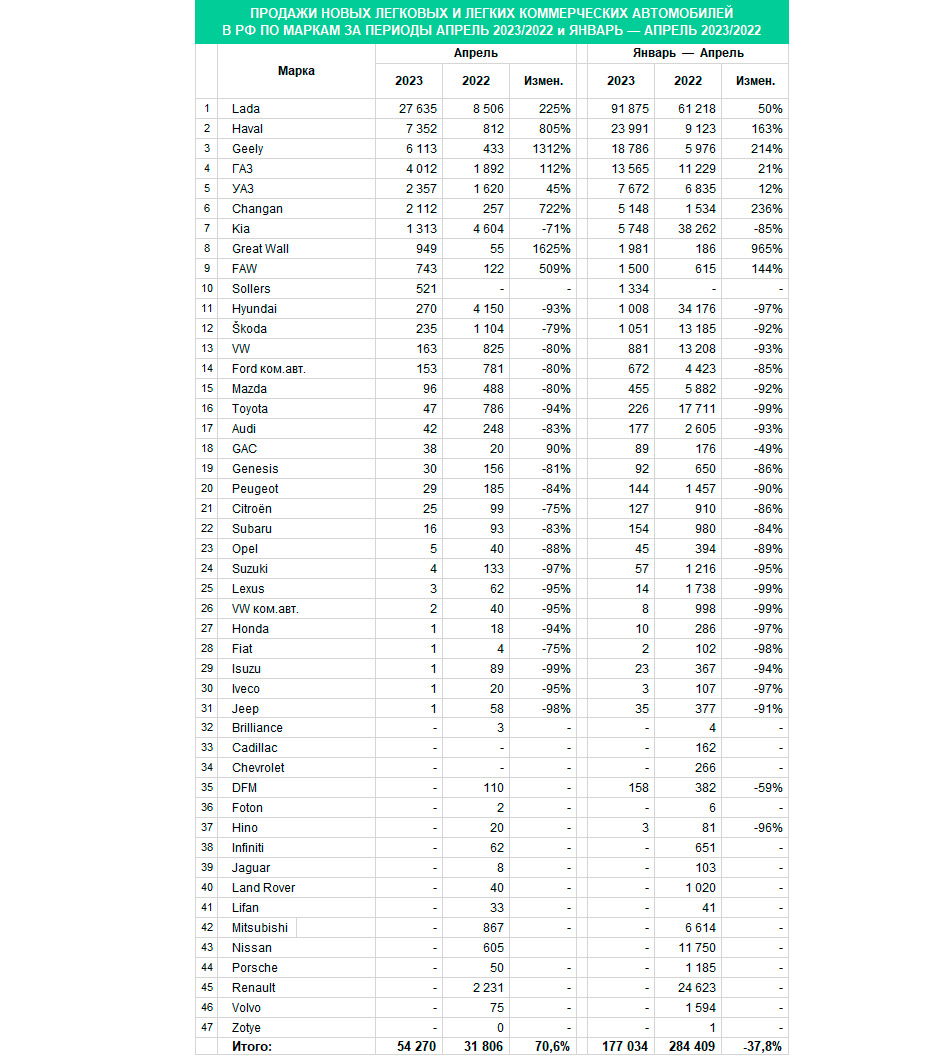 2023-cü ilin aprel ayında 16 avtomobil markası Rusiya bazarında satışların sıfır olduğunu bildirib. 2022-ci ilə qədər Rusiyada məşhur olan Renault, Nissan, Land Rover və Mitsubishi aprel ayını belə nəticələrlə başa vuraraq Rusiya bazarında satışlarını dayandırıb. Bundan başqa, Brilliance, Cadillac, Chevrolet, DFM, Foton, Hino, Infiniti, Jaguar, Lifan, Porsche, Volvo və Zotye bir dənə də olsun avtomobil satmayıb.