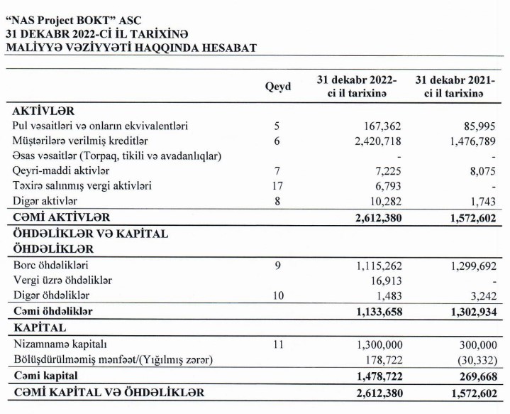 “NAS Project BOKT” kredit portfeli (müştərilərə verilmiş kreditlər) 2022-ci ildə 2021-ci illə müqayisədə 944 min manat və ya 64% artaraq 2 milyon 421 min manata yüksəlib. Təşkilatın kredit portfeli 2021-ci ilin sonunda 1 milyon 477 min manata çatmışdı.