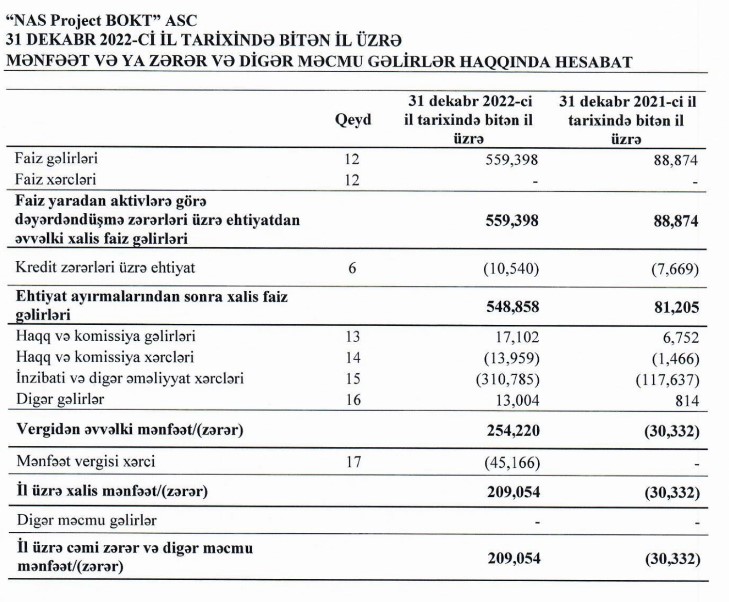 “NAS Project BOKT” ASC 2022-ci ili 209 min manat xalis mənfəət ilə başa vurub. Halbuki, təşkilat 2021-ci ili 30 min manat xalis zərər ilə bağlamışdı.
