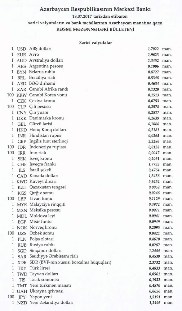 İyulun 17-də rəsmi olaraq 1 dollar 1,7022 manata, 1 avro isə 1.9509 manata bərabər idi.