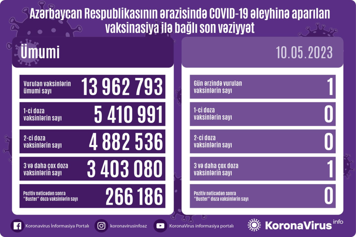 Azərbaycanda son sutkada koronavirus (COVID-19) əleyhinə 1 vaksin vurulub. Son sutkada birinci, ikinci və pozitiv nəticədən sonra buster doza üzrə peyvənd vurulmayıb. Üç və daha çox doza üzrə vaksinasiya olunanların sayı 1 olub.