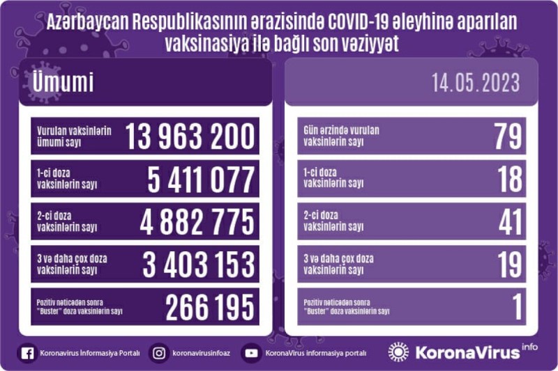 Azərbaycanda son sutkada koronavirus (COVID-19) əleyhinə 79 vaksin vurulub. Bir gündə birinci mərhələ üzrə vaksinasiya olunanların sayı 18, ikinci mərhələ üzrə vaksinasiya olunanların sayı 41, 3-cü və daha çox doza üzrə vaksinasiya olunanların sayı 19, pozitiv nəticədən sonra buster doza olunanların sayı isə 1 nəfərdir.