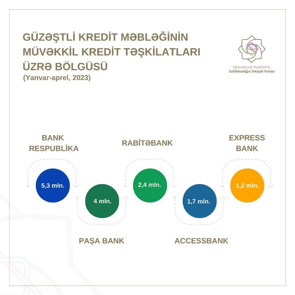 2023-cü ilin 4 ayı ərzində 343 layihənin maliyyələşdirilməsinə 16,6 milyon manat güzəştli kredit verilib. Verilmiş kreditlər hesabına 231 yeni iş yerinin yaradılması nəzərdə tutulur.