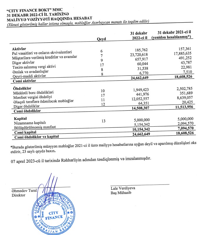 "City Finance BOKT" tərəfindən müştərilərə verilmiş kreditlər (kredit portfeli) 2022-ci ildə 2021-ci illə müqayisədə 5 milyon 836 min manat və ya 32,6% artaraq 23 milyon 720 min manata çatıb.