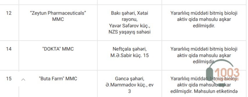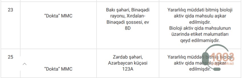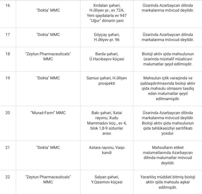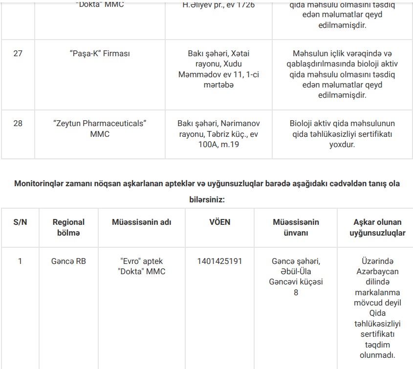 Yoxlamalar zamanı nöqsan aşkar edilən apteklər, həmçinin bioloji aktiv qida məhsullarının etiket və istifadə təlimatlarında qeydə alınan uyğunsuzluqlarla aşağıdakı cədvəllər vasitəsilə tanış ola bilərsiniz: