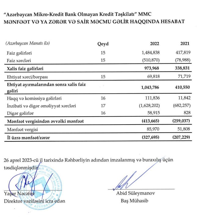 "Azərbaycan Mikro-Kredit Bank Olmayan Kredit Təşkilatı" MMC 2022-ci ili 327 min manat xalis zərər ilə başa vurub. Təşkilat 2021-ci ili 207 min manat xalis zərər ilə bağlamışdı. Beləliklə, ötən il "Azərbaycan Mikro-Kredit"in xalis zərəri 120 min manat və ya 58% artıb. Xalis zərərin artması xərclərin gəlirlərdən daha çox artması ilə bağlıdır. Ötən il BOKT-ın kredit portfeli və gəlirləri kəskin artıb.