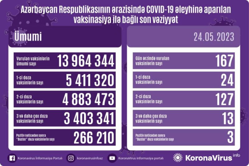 Azərbaycanda son sutkada koronavirus (COVID-19) əleyhinə 167 vaksin vurulub. Bir gündə birinci mərhələ üzrə vaksinasiya olunanların sayı 24, ikinci mərhələ üzrə vaksinasiya olunanların sayı 127, üç və daha çox doza üzrə vaksinasiya olunanların sayı 13, pozitiv nəticədən sonra buster doza üzrə vaksinasiya olunanların sayı 3 nəfərdir.