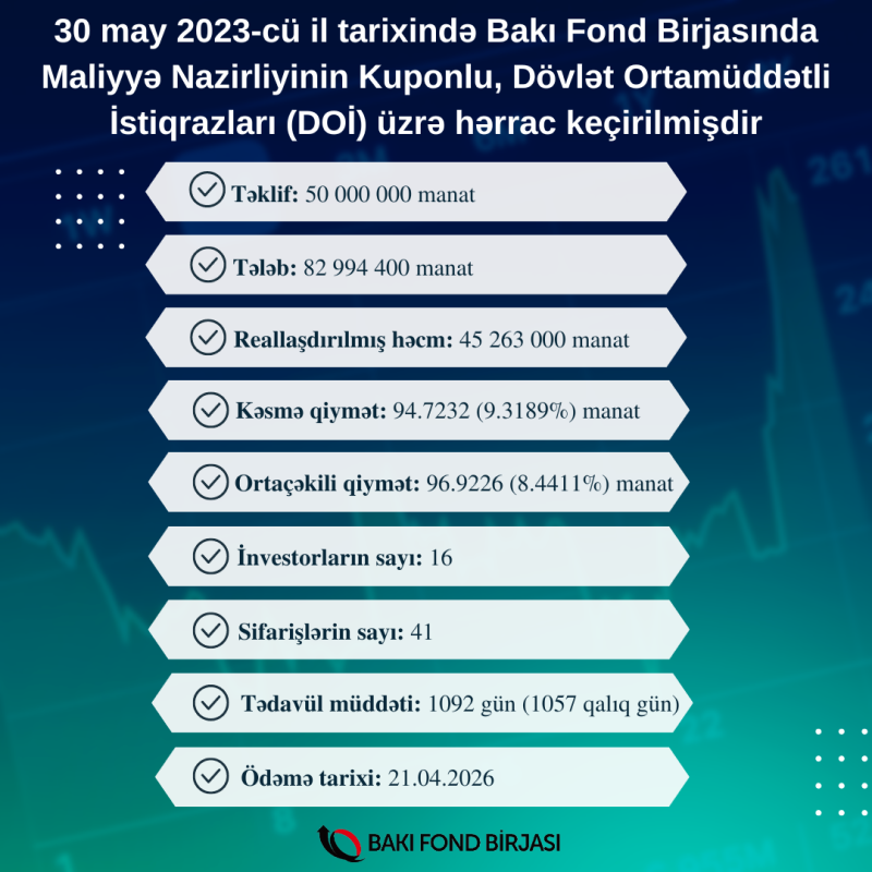 30 may 2023-cü il tarixində Bakı Fond Birjasında Azərbaycan Respublikası Maliyyə Nazirliyinin AZ0201040109 ISIN-li, 50 milyon manat həcmində, 1092 gün (1057 qalıq gün) olan tədavül müddətli Kuponlu, Dövlət Ortamüddətli İstiqrazlarının (DOİ) yerləşdirilməsi üzrə hərrac keçirilib.