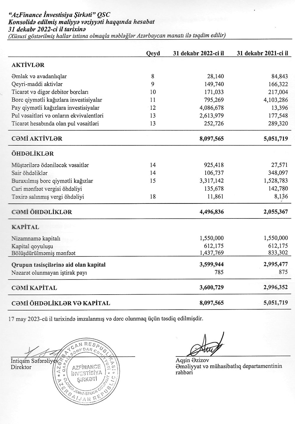 (®) “AzFinance İnvestisiya Şirkəti” QSC-nin aktivləri 2022-ci ildə kəskin artaraq 8 milyon 97 min 565 manata çatıb.