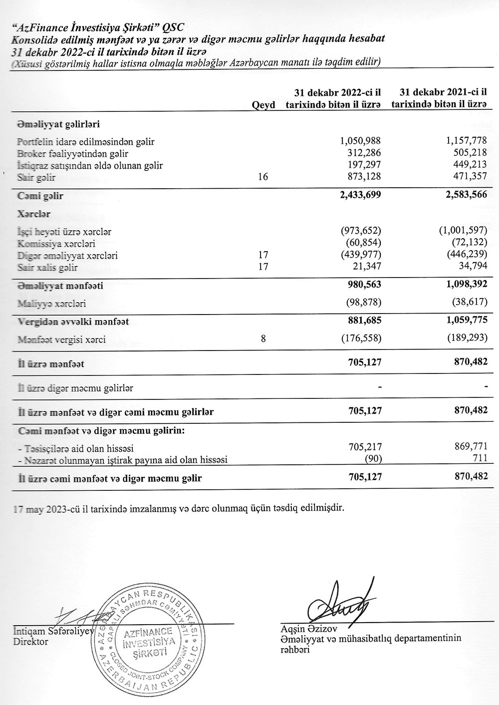 “AzFinance İnvestisiya Şirkəti” 2022-ci ili 705 min 127 manat mənfəətlə başa vurub. 2021-ci ildə isə investisiya şirkətinin mənfəəti 870 min 482 manat olmuşdu.