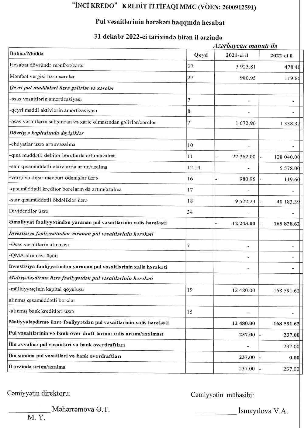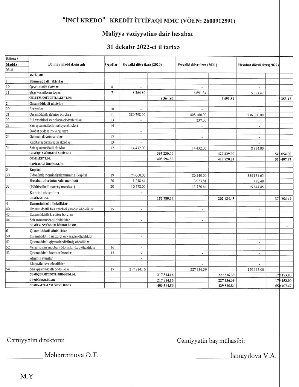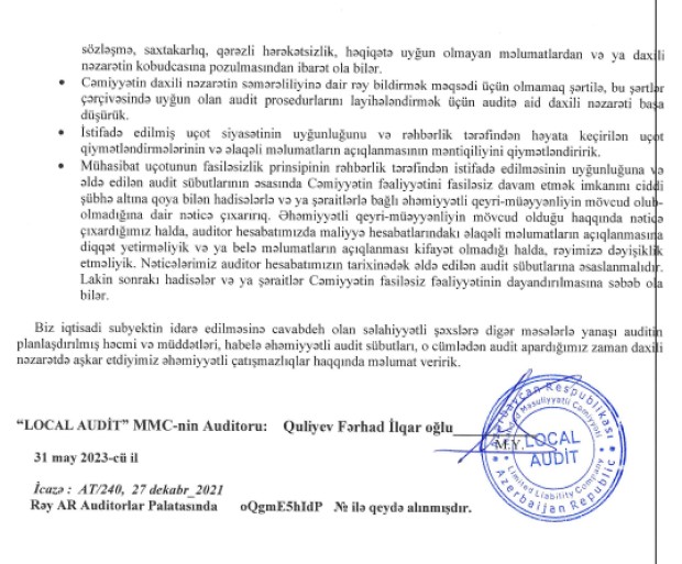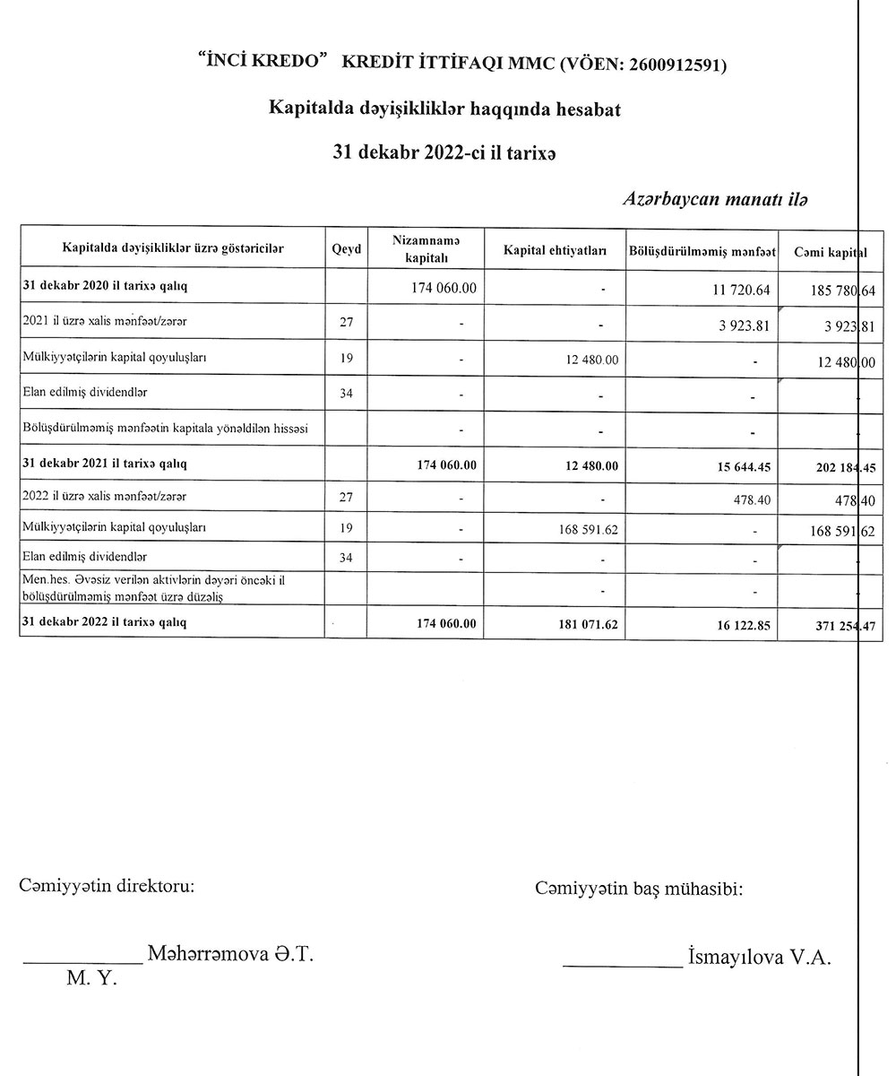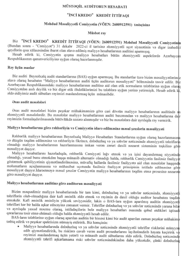 "İnci Kredo" Kredit İttifaqı MMC-nin 31 Dekabr 2022-ci il tarixində bitən il üzrə maliyyə hesabatları