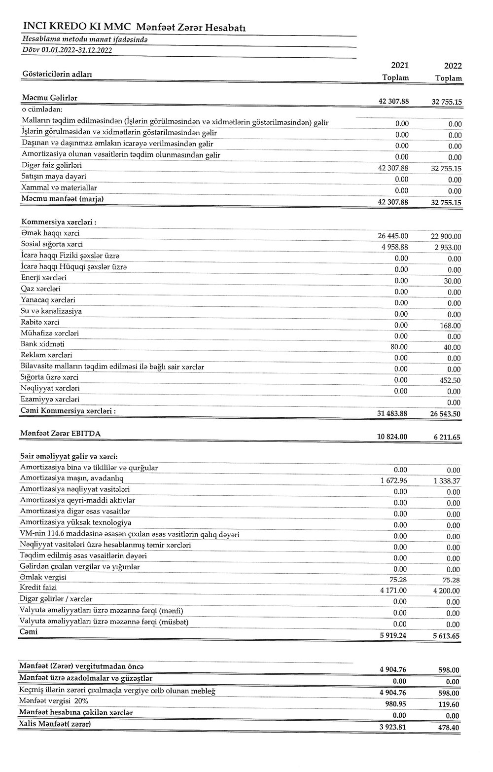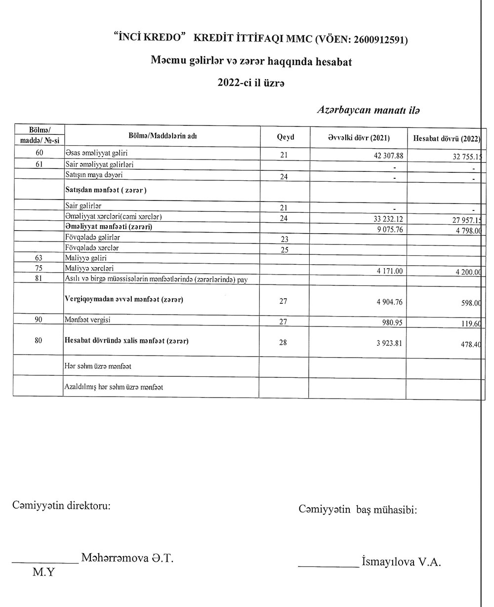 "İnci Kredo" Kredit İttifaqı MMC-nin 2022-ci il üzrə maliyyə göstəriciləri