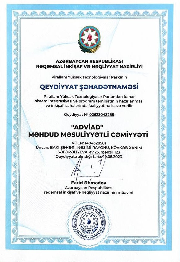 “Adviad” MMC - Pirallahı Yüksək Texnologiyalar Parkından kənar yeni rezidentliyə qəbul olunub