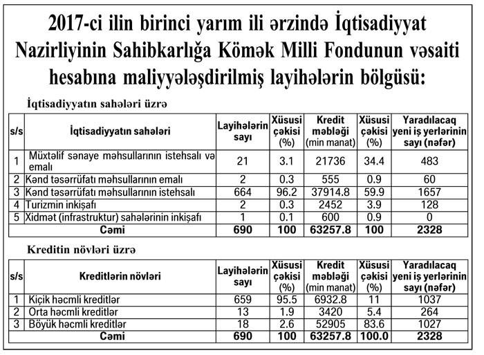 “Marja” xəbər verir ki, 2017-ci ilin birinci yarısında Sahibkarlığa Kömək Milli Fondu 690 layihənin maliyyələşdirilməsinə 63 milyon 258 min manat güzəştli kredit ayırıb. Maliyyələşdirilmiş layihələrin 664-ü və ya 96,2%-i kənd təsərrüfatı məhsullarının istehsalı üzrə olmuşdur. Bu layihələrə 37 milyon 915 min manat ayrılmışdır ki, bu da cəmi kreditlərin 60%-dir.
