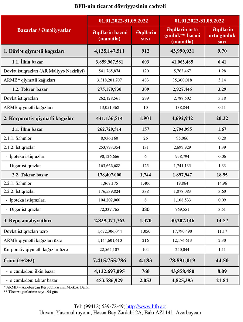 Bakı Fond Birjasında 2022-ci ilin yanvar-may ayları ərzind tarixləri ərzində qiymətli kağızlar üzrə keçirilən əməliyyatların ümumi həcmi 7 milyard 415 milyon 756 min manat təşkil etmişdi.