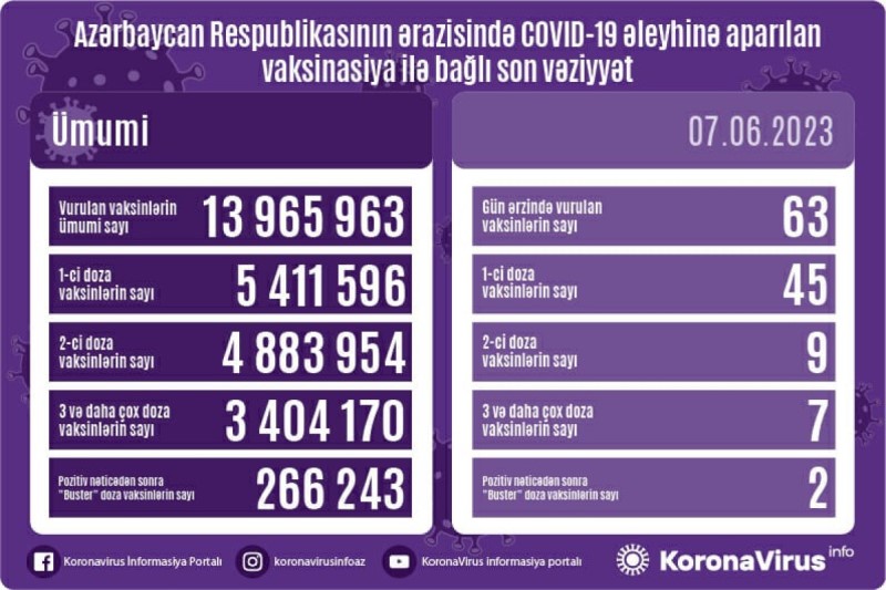 Azərbaycanda son sutkada koronavirus (COVID-19) əleyhinə 63 vaksin vurulub. Bir gündə birinci mərhələ üzrə vaksinasiya olunanların sayı 45, ikinci mərhələ üzrə vaksinasiya olunanların sayı 9, üç və daha çox doza üzrə vaksinasiya olunanların sayı 7, pozitiv nəticədən sonra buster doza üzrə vaksinasiya olunanların sayı 2 nəfərdir.
