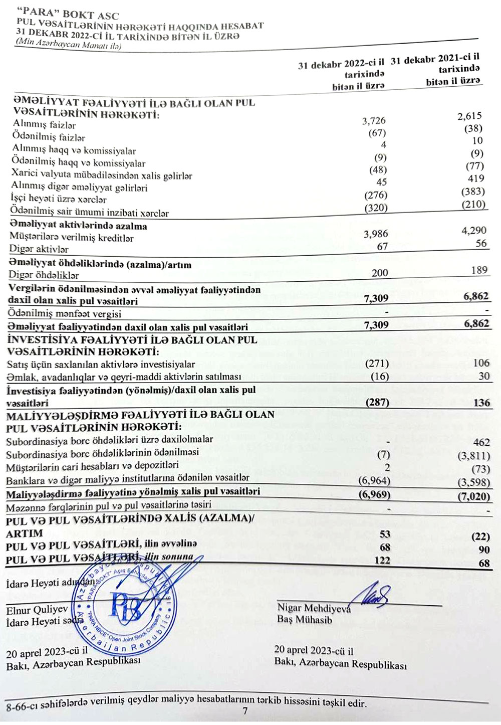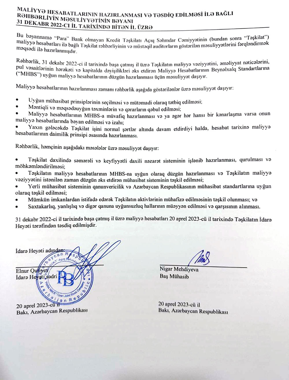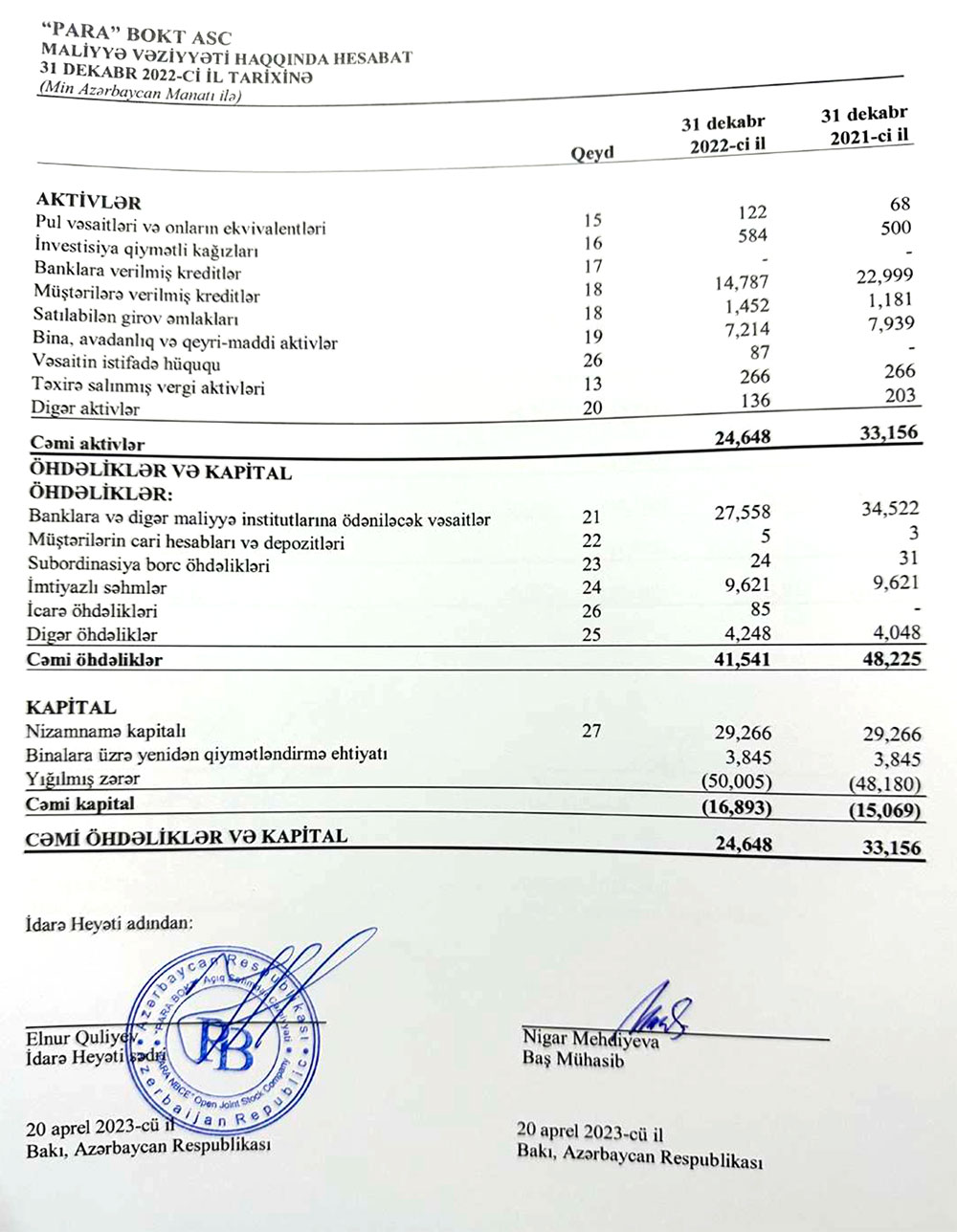 "Para Bank Olmayan Kredit Təşkilatı" ASC 31 dekabr 2022-ci il tarixində bitən il üzrə maliyyə hesabatını dərc edib.
