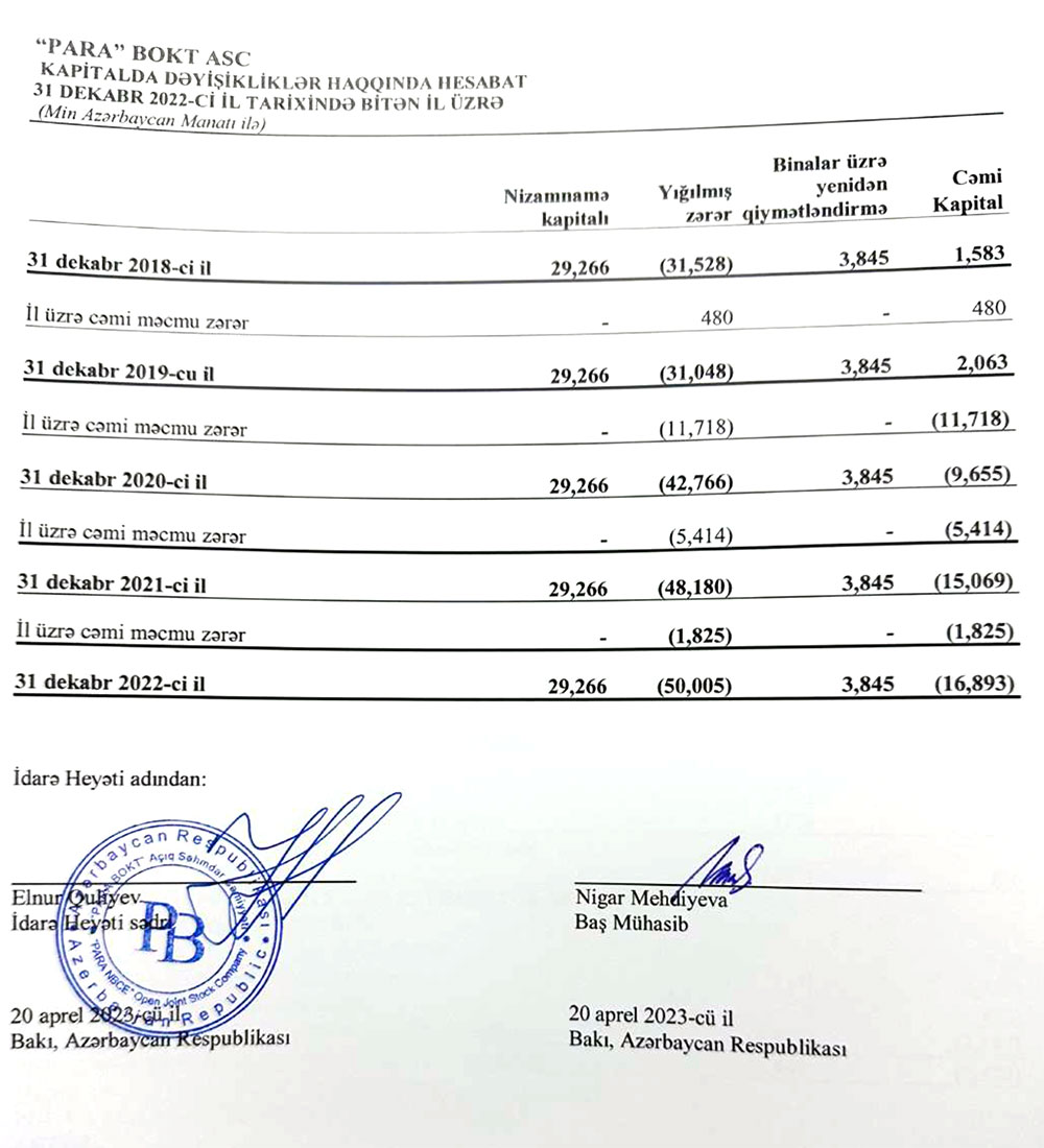 Ötən il "Para BOKT" dəyərsizləşmə üzrə 5 milyon 652 min manat itirdiyi üçün 2023-cü ili 1 milyon 825 min manat xalis zərər ilə bağlayıb. "Para BOKT" ASC-nin xalis zərəri 2022-ci ildə 2021-ci illə müqayisədə 3 milyon 589 min manat və və ya 3 dəfə azalıb.