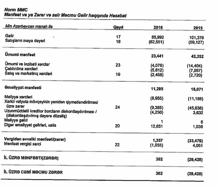 “Marja” şirkətin maliyyə hesabatlarına istinadən xəbər verir ki, 2015-ci ildə 101,4 milyon manat olan satışlar 2016-cı ildə 86 milyon manat təşkil edib. Satış, inzibati və digər xərclər çıxıldıqdan sonra şirkətin 11,3 milyon manat əməliyyat mənfəəti qalıb. Maliyyə xərcləri, xarici valyuta mövqeyinin yenidən qiymətləndirilməsi və kreditor borclarının diskontlaşdırılması əməliyyat mənfəətinin böyük hissəsini silib. Eyni zamanda, "Norm" 1 milyon manatdan çox mənfəət vergisi ödəyib.
