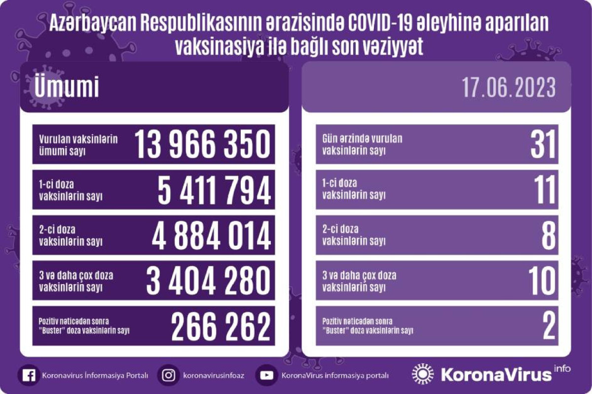 Azərbaycanda son sutkada koronavirus (COVID-19) əleyhinə 31 vaksin vurulub. Bir gündə birinci mərhələ üzrə vaksinasiya olunanların sayı 11, ikinci mərhələ üzrə vaksinasiya olunanların sayı 8, üç və daha çox doza üzrə vaksinasiya olunanların sayı 10, pozitiv nəticədən sonra buster doza üzrə vaksinasiya olunanların sayı 2 nəfərdir.