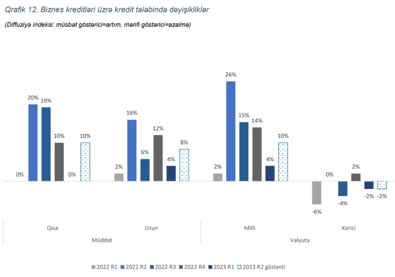 Banklar 2023-cü ilin II rübü üçün biznes kreditləri üzrə gözləntilərində milli valyutada, habelə qısamüddətli və uzunmüddətli kreditlərə tələbin artmasını, xarici valyutada olan kreditlərə isə tələbin dəyişməyəcəyini proqnozlaşdırırlar.