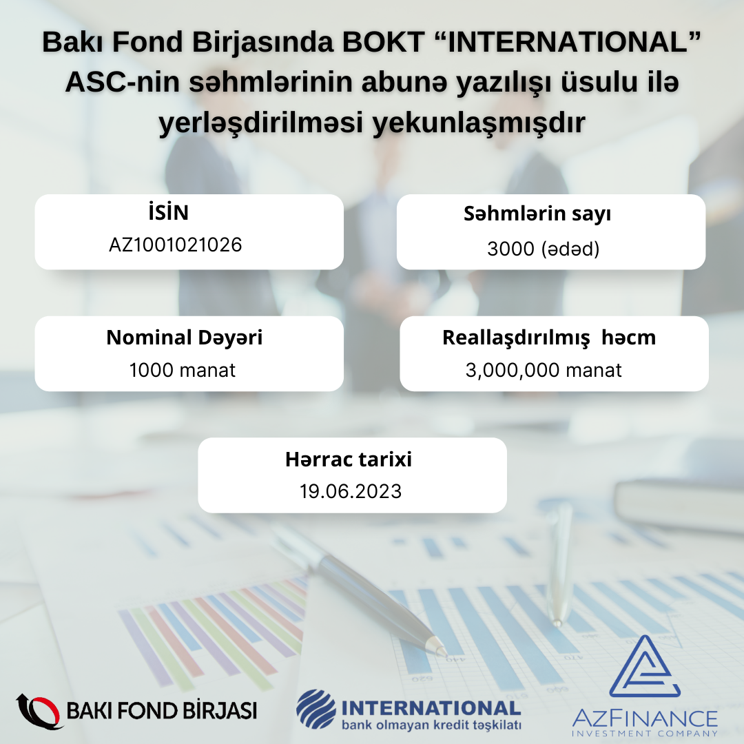 19 iyun 2023-cü il tarixində Bakı Fond Birjasında BOKT “İnternational” ASC-nin AZ1001021026 dövlət qeydiyyat nömrəli 3 milyon manat həcmində, adi adlı sənədsiz səhmlərinin abunə yazılışı üsulu ilə yerləşdirilməsi yekunlaşıb.