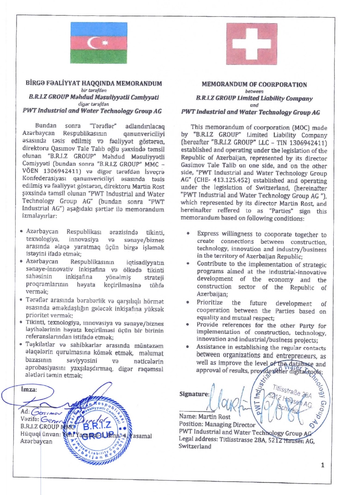 Azərbaycanın “B.R.I.Z Group” şirkəti böyük və təcrübəli İsveçrə şirkətilə birgə fəaliyyət göstərəcək(®) Ölkəmizin tikinti sektorunda əmin addımlarla irəliləyən 2020-ci ildə təsis edilmiş “B.R.I.Z Group” MMC şirkəti İsveçrənin “PWT Industrial and Water Technology Group AG” şirkəti ilə birgə fəaliyyət haqqında memorandum imzalayıb.