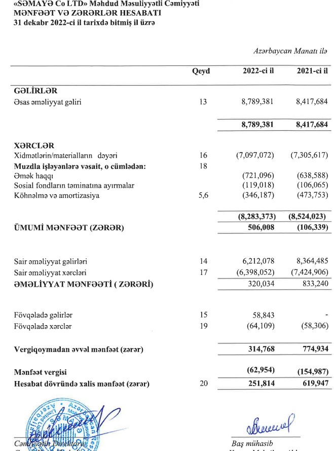 Gəmilər ilə yüklərin daşınması xidmətləri göstərən “Səmayə CO LTD” MMC şirkəti 2022-ci ili 252 min manat xalis mənfəət ilə başa vurub. Şirkət 2021-ci ili 620 min manat xalis mənfəət ilə bağlamışdı. Beləliklə, ötən il "Səmayə CO LTD”nin xalis mənfəəti 2,5 dəfə azalıb. Xalis mənfəətin azalması əməkhaqqı xərclərinin artması və sair əməliyyat gəlirlərinin düşməsindən qaynaqlanır.