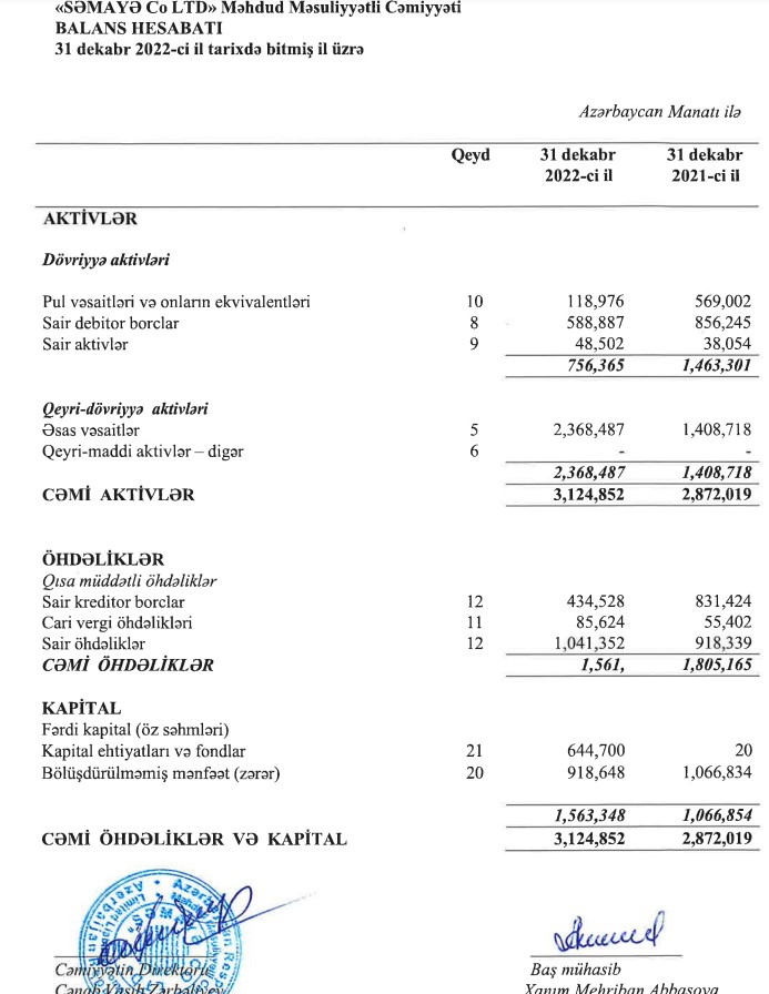 31 dekabr 2022-ci il tarixində “Səmayə CO LTD”nin 3 milyon 125 min manat cəmi aktivlərə malik olub. Şirkət 2021-ci ilin sonunda 2 milyon 872 min manat cəmi aktivlərə malik idi.